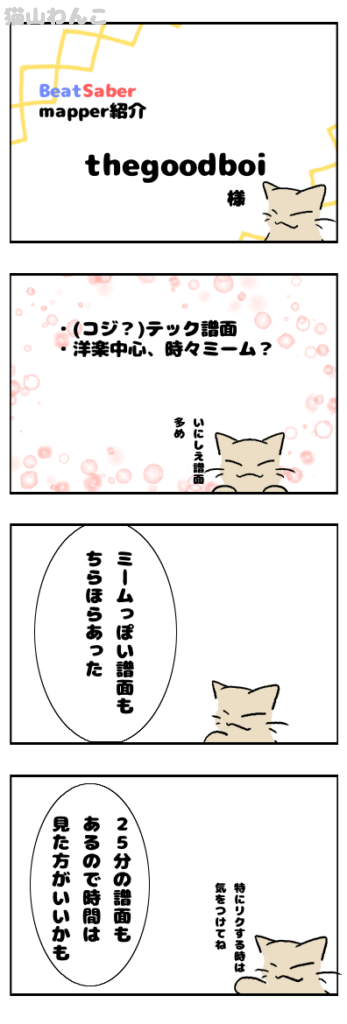 【Mapper紹介】thegoodboi様 スポンサーリンク Mapper紹介 2024.09.26 ※情報は記載当時のものです※海外のミームとかも譜面化されてるMapper様ᐠ( ᐛ )ᐟなんか時々コジなのかペペガなのかが入ってきてた(੭ ᐕ))?現在39譜面公開されており、難易度別はこんな感じ。Easy:4 Normal:5 Hard:5 Expert:16 Expert+:40BeatSaverMapper紹介(自薦他薦問わず)の情報はこちらからお願いします! favorite0いいね送信中です×※コメントは最大500文字、5回まで送信できます送信送信中です送信しました!