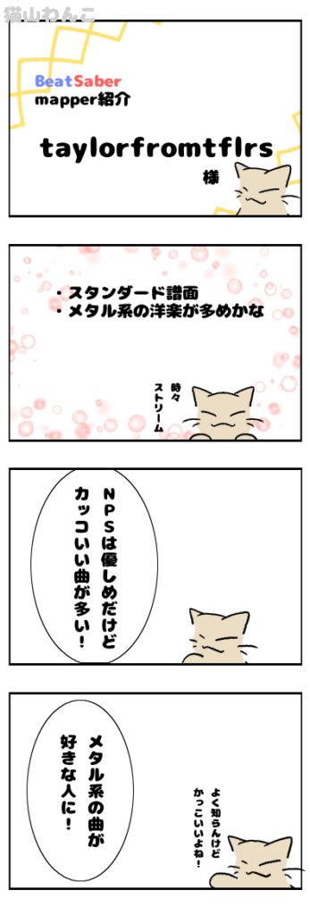 【Mapper紹介】taylorfromtflrs様 スポンサーリンク Mapper紹介 2025.03.17 ※情報は記載当時のものです※スタンダード譜面のMapper様!(๑•̀ㅂ•́)و✧Exがメインなので少しずつ慣れてきた中級者なり立ての方にも!٩(๑òωó๑)۶現在175譜面公開されており、難易度別はこんな感じ。Easy:1 Normal:8 Hard:29 Expert:141 Expert+:7BeatSaverMapper紹介(自薦他薦問わず)の情報はこちらからお願いします! favorite1いいね送信中です×※コメントは最大500文字、5回まで送信できます送信送信中です送信しました!