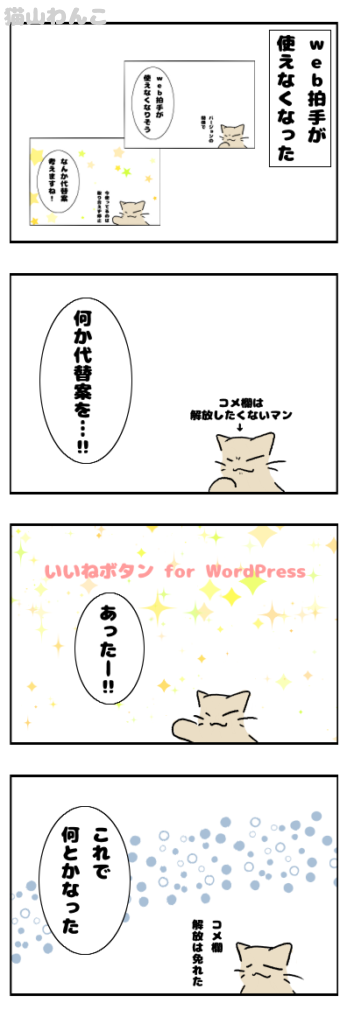 代替案 スポンサーリンク わんこの日常 2025.07.18 「doやってdoつくろう?」様の「いいねボタン for WordPress」に変えました!欲しい機能があってめっちゃ助かりました_(┐「ε:)_ favorite7いいね送信中です×※コメントは最大500文字、5回まで送信できます送信送信中です送信しました!