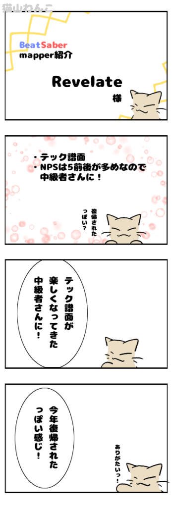 【Mapper紹介】Revelate様 スポンサーリンク Mapper紹介 2025.08.24 ※情報は記載当時のものです※テック譜面のMapper様!(๑•̀ㅂ•́)و✧綺麗な感じの洋楽メインで、今年復帰されたっぽい!٩(๑òωó๑)۶現在49譜面公開されており、難易度別はこんな感じ。Easy:3 Normal:0 Hard:3 Expert:16 Expert+:49BeatSaverMapper紹介(自薦他薦問わず)の情報はこちらからお願いします! favorite0いいね送信中です×※コメントは最大500文字、5回まで送信できます送信送信中です送信しました!
