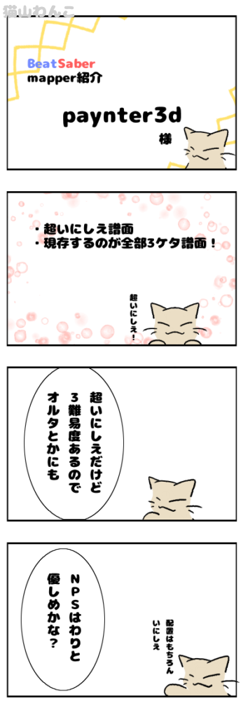 【Mapper紹介】paynter3d様 スポンサーリンク Mapper紹介 2025.09.01 ※情報は記載当時のものです※超いにしえ譜面のMapper様!(๑•̀ㅂ•́)و✧超いにしえだけど難易度3つあるのでオルタにはいいかも?(੭ ᐕ))?現在2譜面公開されており、難易度別はこんな感じ。Easy:0 Normal:2 Hard:2 Expert:2 Expert+:0BeatSaverMapper紹介(自薦他薦問わず)の情報はこちらからお願いします! favorite3いいね送信中です×※コメントは最大500文字、5回まで送信できます送信送信中です送信しました!