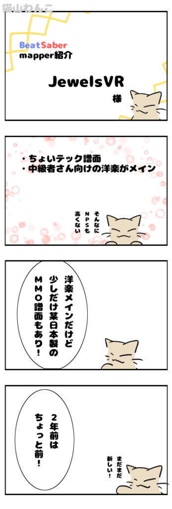 【Mapper紹介】JewelsVR様 スポンサーリンク Mapper紹介 2025.10.01 ※情報は記載当時のものです※ちょいテック譜面のMapper様!(๑•̀ㅂ•́)و✧洋楽メインだけどEx譜面も多いので中級者なりたてさんにもᐠ( ᐛ )ᐟ現在130譜面公開されており、難易度別はこんな感じ。Easy:2 Normal:0 Hard:0 Expert:68 Expert+:62BeatSaverMapper紹介(自薦他薦問わず)の情報はこちらからお願いします! favorite0いいね送信中です×※コメントは最大500文字、5回まで送信できます送信送信中です送信しました!