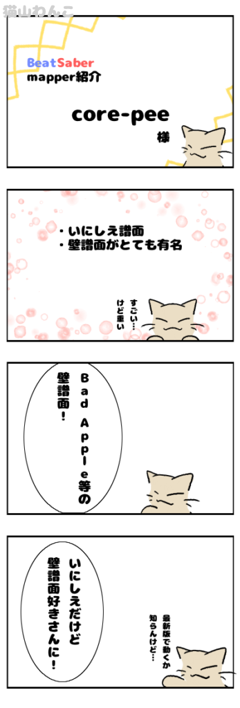 【Mapper紹介】core-pee様 スポンサーリンク Mapper紹介 2025.10.15 ※情報は記載当時のものです※いにしえ譜面のMapper様!(๑•̀ㅂ•́)و✧壁譜面がとてもすごいのでぜひ!ᐠ( ᐛ )ᐟ<要高スペPC現在32譜面公開されており、難易度別はこんな感じ。Easy:8 Normal:5 Hard:14 Expert:19 Expert+:32BeatSaverMapper紹介(自薦他薦問わず)の情報はこちらからお願いします! favorite8いいね送信中です×※コメントは最大500文字、5回まで送信できます送信送信中です送信しました!