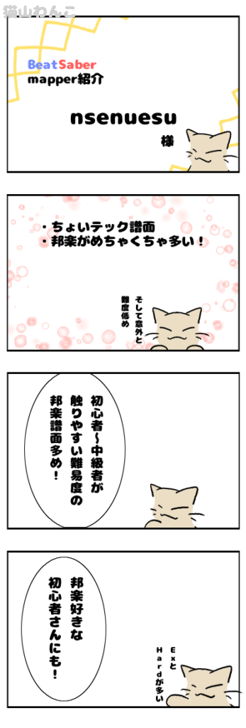 【Mapper紹介】nsenuesu様 スポンサーリンク Mapper紹介 2025.10.29 ※情報は記載当時のものです※ちょいテック譜面のMapper様!(๑•̀ㅂ•́)و✧初心者さんが触りやすい難易度の邦楽が多め!٩(๑òωó๑)۶現在107譜面公開されており、難易度別はこんな感じ。Easy:2 Normal:7 Hard:61 Expert:99 Expert+:15BeatSaverMapper紹介(自薦他薦問わず)の情報はこちらからお願いします! favorite2いいね送信中です×※コメントは最大500文字、5回まで送信できます送信送信中です送信しました!