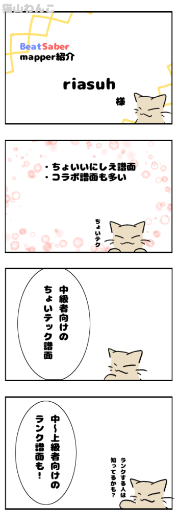 【Mapper紹介】riasuh様 スポンサーリンク Mapper紹介 2026.01.11 ※情報は記載当時のものです※ちょいいにしえ譜面のMapper様!(๑•̀ㅂ•́)و✧ちょっと前のだけど中級者さん向けのちょいテックが多いかなぁ?(੭ ᐕ))?現在17譜面公開されており、難易度別はこんな感じ。Easy:0 Normal:1 Hard:6 Expert:10 Expert+:20BeatSaverMapper紹介(自薦他薦問わず)の情報はこちらからお願いします! favorite2いいね送信中です×※コメントは最大500文字、5回まで送信できます送信送信中です送信しました!