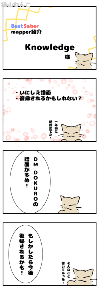 【Mapper紹介】Knowledge様 スポンサーリンク Mapper紹介 2026.01.31 ※情報は記載当時のものです※いにしえ譜面のMapper様!(๑•̀ㅂ•́)و✧時々低難度もあったりするので初心者さんでも打てるのはあるかも?(੭ ᐕ))?現在25譜面公開されており、難易度別はこんな感じ。Easy:9 Normal:1 Hard:7 Expert:16 Expert+:16BeatSaverMapper紹介(自薦他薦問わず)の情報はこちらからお願いします! favorite2いいね送信中です×※コメントは最大500文字、5回まで送信できます送信送信中です送信しました!