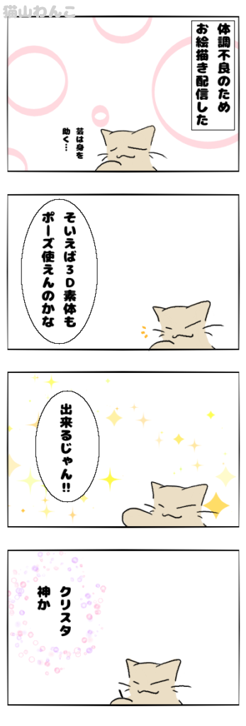 楽だった スポンサーリンク わんこの日常 2026.02.05 まぁ、3D素体なので使えるんだろうなとは思ったんだけど使えて「神!」ってなりました( ˘ω˘ )クリスタはいいぞぉᐠ( ᐛ )ᐟ<4コマでは使ってないけどな!!! favorite4いいね送信中です×※コメントは最大500文字、5回まで送信できます送信送信中です送信しました!