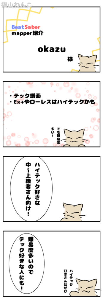 【Mapper紹介】okazu様 スポンサーリンク Mapper紹介 2026.02.06 ※情報は記載当時のものです※テック譜面のMapper様!(๑•̀ㅂ•́)و✧テック~ハイテックなので中~上級者さん向け譜面が多めかな(੭ ᐕ))?現在50譜面公開されており、難易度別はこんな感じ。Easy:9 Normal:8 Hard:20 Expert:29 Expert+:60BeatSaverTwitterMapper紹介(自薦他薦問わず)の情報はこちらからお願いします! favorite1いいね送信中です×※コメントは最大500文字、5回まで送信できます送信送信中です送信しました!