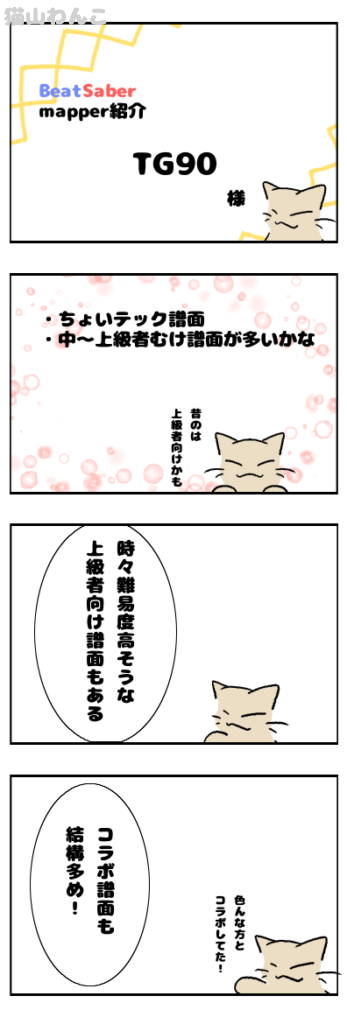 【Mapper紹介】TG90様 スポンサーリンク Mapper紹介 2026.02.20 ※情報は記載当時のものです※ちょいテック譜面のMapper様!(๑•̀ㅂ•́)و✧中~上級者さん向けの洋楽譜面が多めかな(੭ ᐕ))?現在59譜面公開されており、難易度別はこんな感じ。Easy:5 Normal:4 Hard:11 Expert:25 Expert+:74BeatSaverMapper紹介(自薦他薦問わず)の情報はこちらからお願いします! favorite0いいね送信中です×※コメントは最大500文字、5回まで送信できます送信送信中です送信しました!