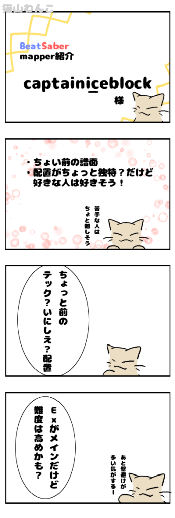 【Mapper紹介】captain_iceblock様 スポンサーリンク Mapper紹介 2026.03.28 ※情報は記載当時のものです※ちょい前の譜面のMapper様!(๑•̀ㅂ•́)و✧Exがメインだけどちょっと難しそうな所もあるので中~上級者さん向けかな(੭ ᐕ))?現在23譜面公開されており、難易度別はこんな感じ。Easy:0 Normal:0 Hard:1 Expert:19 Expert+:3BeatSaverMapper紹介(自薦他薦問わず)の情報はこちらからお願いします! favorite2いいね送信中です×※コメントは最大500文字、5回まで送信できます送信送信中です送信しました!